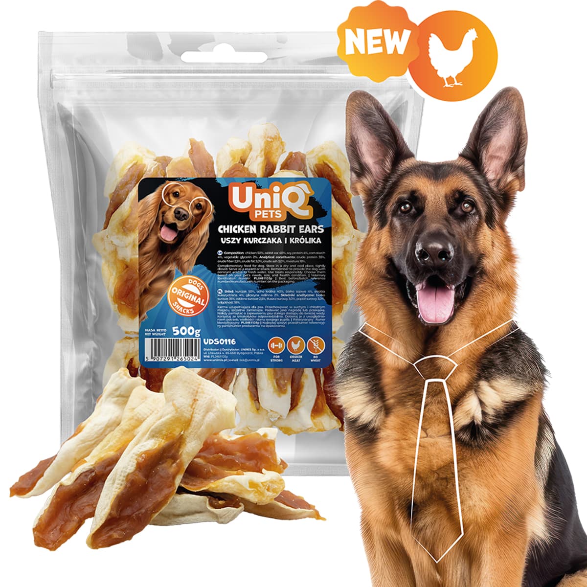 Uniq 500gr Λιχουδιά για Σκύλους Αυτιά Κουνελιού με Κοτόπουλο. Προσφέρετε στο κουτάβι σας αυτόν τον μοναδικό συνδυασμό πρωτεΐνης από αυτιά κουνελιού με κοτόπουλο, μια τροφή για μάσημα χαμηλής περιεκτικότητας σε λιπαρά και υψηλής πρωτεΐνης που ικανοποιεί τα ένστικτα, ενώ παράλληλα προάγει την οδοντική υγεία. Ιδανική για σκύλους με ευαισθησίες που λαχταρούν ποικιλία.