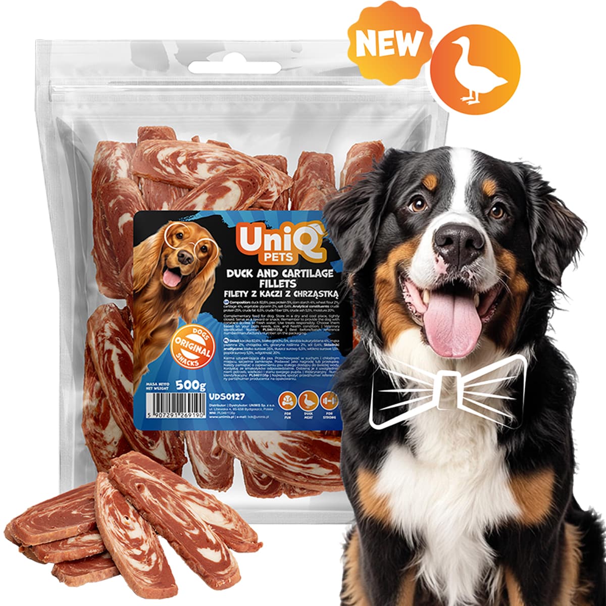 Uniq 500gr Λιχουδιά για Σκύλους Φιλέτο Πάπιας και Χόνδρου. Ένας εξαιρετικός συνδυασμός από μαλακό φιλέτο πάπιας και φυσικό χόνδρο, που ενισχύει τη μάσηση και προσφέρει μια ιδιαίτερα απολαυστική εμπειρία γεύσης. Η πάπια αποτελεί πηγή υψηλής ποιότητας πρωτεΐνης και σιδήρου, ενώ ο χόνδρος είναι πλούσιος σε κολλαγόνο και βοηθά στην υποστήριξη των αρθρώσεων και των χόνδρων. Κατάλληλη για καθημερινή χρήση, χωρίς τεχνητά πρόσθετα, γλουτένη ή σάκχαρα, αυτή η λιχουδιά είναι ιδανική για την επιβράβευση και την ευεξία του αγαπημένου σας φίλου.