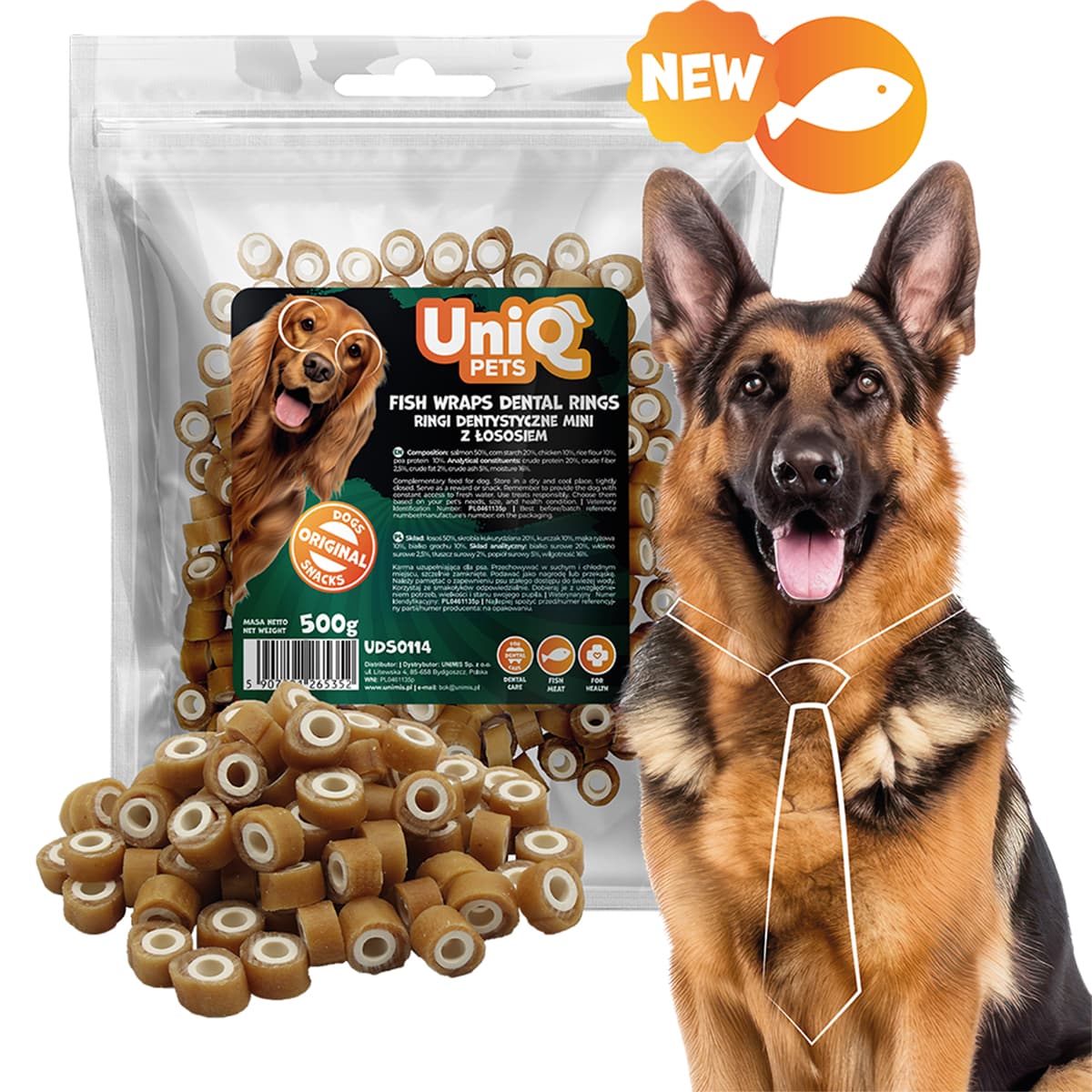 Χαρίστε στον σκύλο σας απολαυστικές και ωφέλιμες λιχουδιές με τα Uniq 500gr Λιχουδιά για Σκύλους Οδοντικά Ρολάκια με Σολομό. Πρόκειται για δαχτυλίδια από δέρμα βοδινού τυλιγμένα με φυσικό φιλέτο σολομού, σχεδιασμένα ειδικά για την προώθηση της στοματικής υγιεινής.