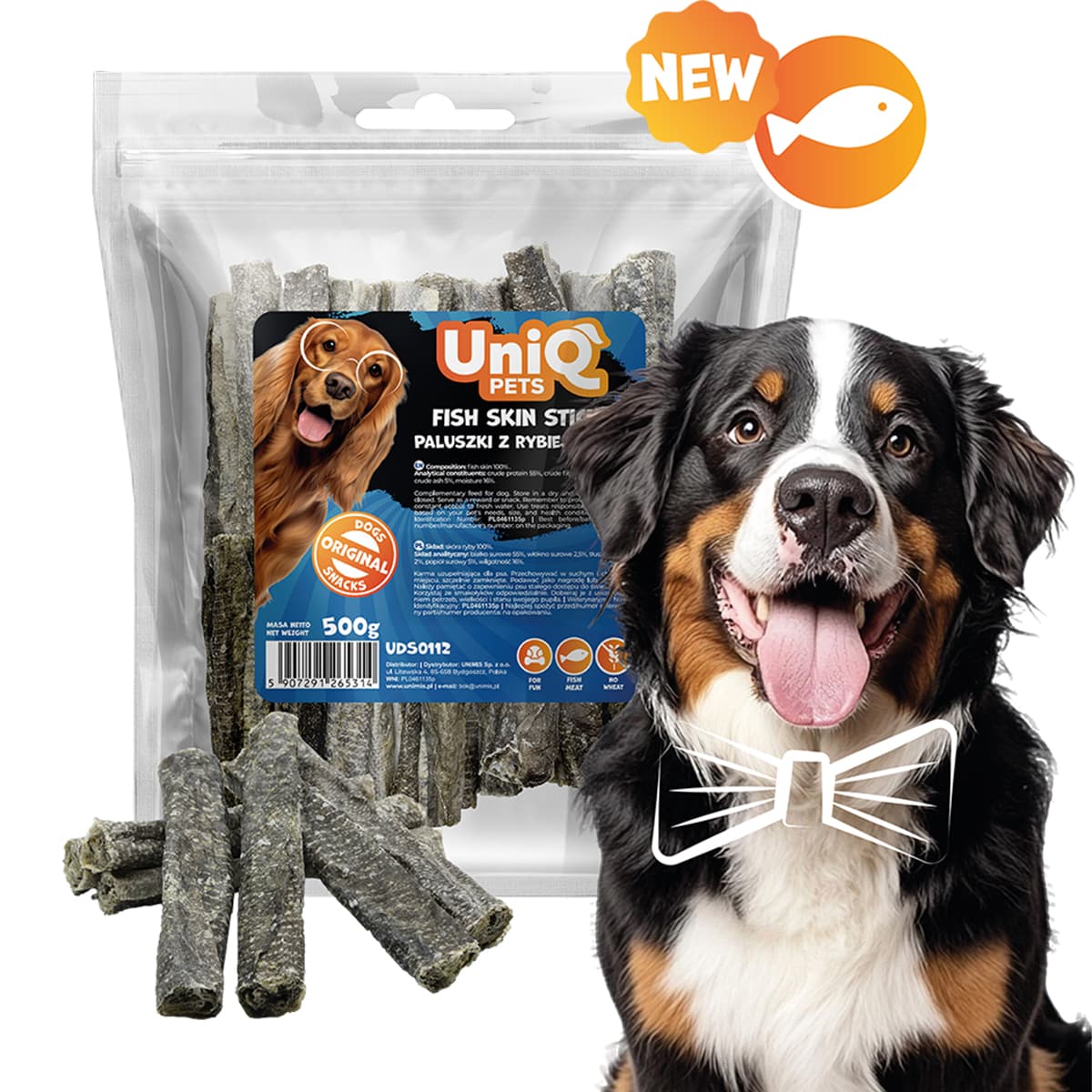 Uniq 500gr Λιχουδιά για Σκύλους Στικς από Δέρμα Ψαριού. Μετατρέψτε το μάσημα σε παιχνίδι με αυτά τα στριφτά στικ από δέρμα ψαριού, η απόλυτη υγιεινή και νόστιμη λιχουδιά για σκύλους, μια φυσική πηγή γλυκοζαμίνης και χονδροϊτίνης, που προάγει την υγεία και την κινητικότητα των αρθρώσεων. Φτιαγμένο με πραγματικό δέρμα ψαριού και σχεδιασμένο για σκύλους που μασούν μέτρια και αγαπούν τις νόστιμες προκλήσεις.