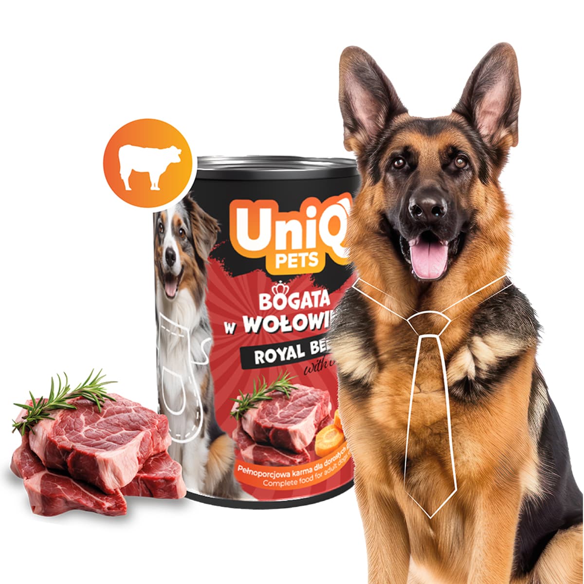 Το Uniq Πατέ 375gr για Ενήλικους Σκύλους με Μοσχάρι είναι υγρή τροφή που με πλούσια περιεκτικότητα σε κρέας 50%, συμπεριλαμβανομένου 37% πραγματικού βοδινού και 3% συκωτιού βοδινού για φυσική γεύση και πρόσθετα θρεπτικά συστατικά. Αυτή η ισορροπημένη συνταγή συνδυάζει υψηλής ποιότητας ζωική πρωτεΐνη με απαραίτητες βιταμίνες, μέταλλα και ταυρίνη για να υποστηρίξει τη συνολική υγεία και ζωτικότητα του σκύλου σας.